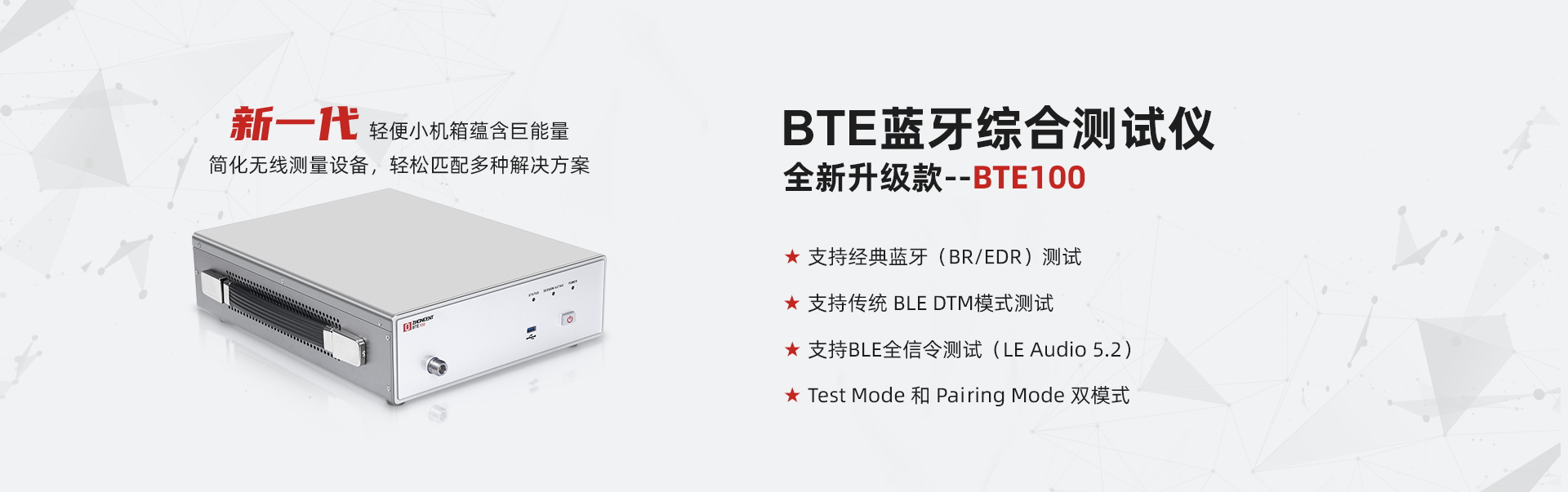 BTE100+是由中承科技獨(dú)立自主研發(fā)的新一代藍(lán)牙射頻協(xié)議綜測儀,支持藍(lán)牙設(shè)備配對信令模式下的功率、頻偏、調(diào)制、接收靈敏度、吞吐量等射頻指標(biāo)精準(zhǔn)測試,支持多種藍(lán)牙協(xié)議版本的深度解析及實(shí)時IQ數(shù)據(jù)捕獲。